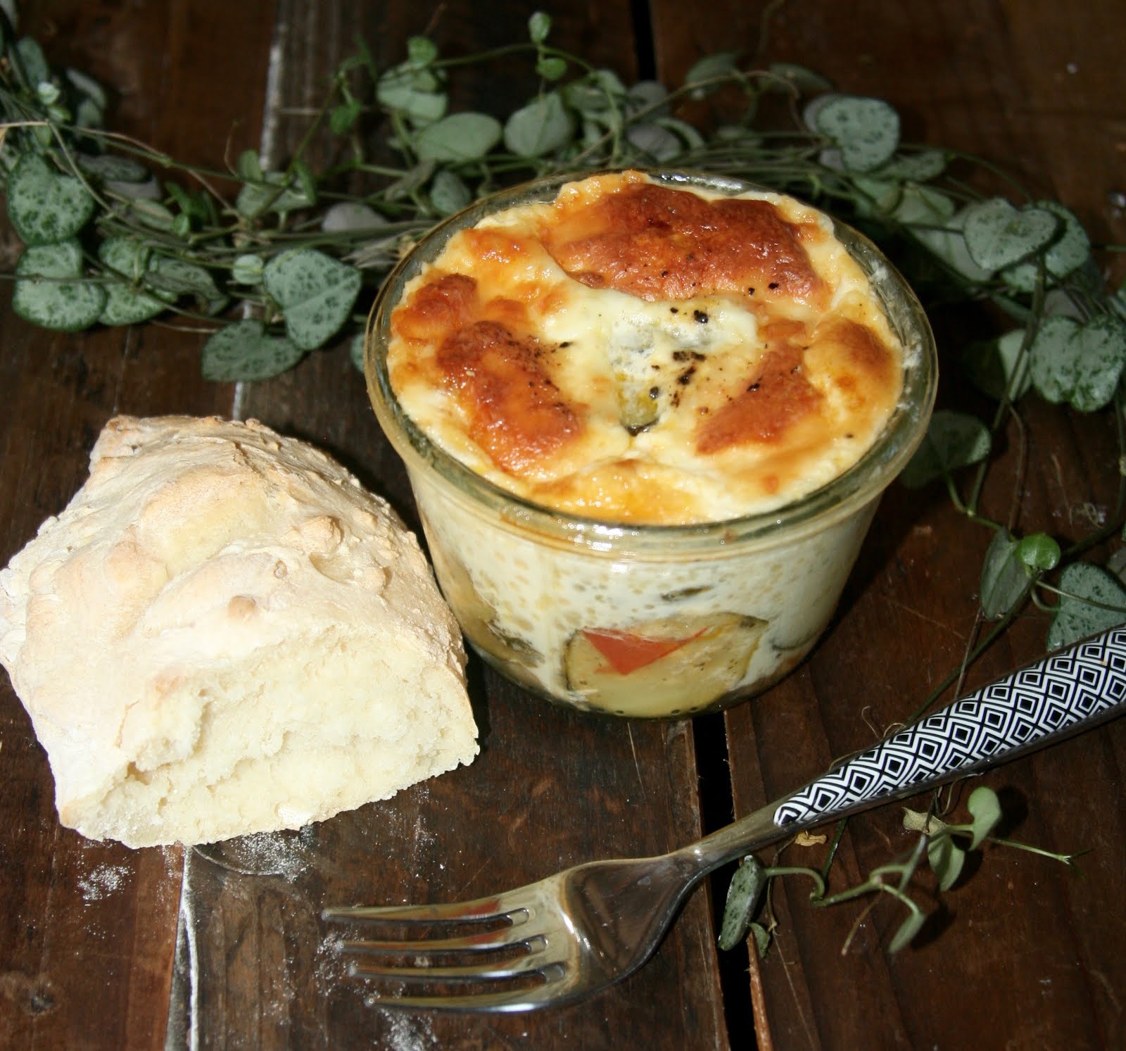 Déposer une couche de courgettes et tomates dans les ramequins.